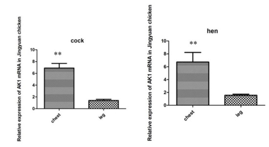 Comparison of AK1 mRNA expression levels in the breast and leg muscles of cock and hen of Jingyuan chickens. ** represents significant difference in expression of AK1 in chest and leg muscles.