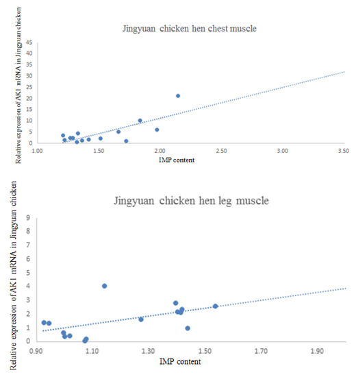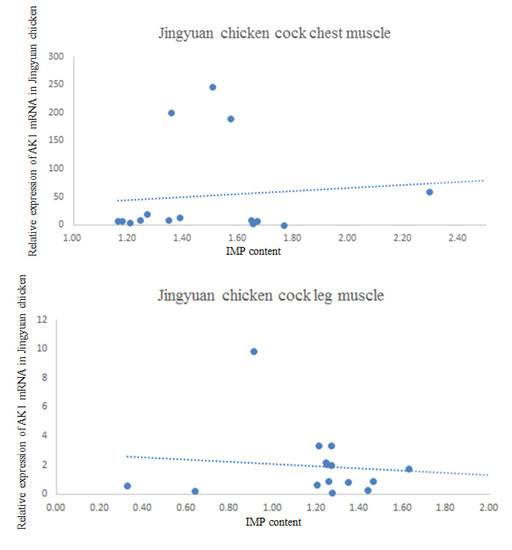 The results of the correlation analysis between AK1 mRNA expression and IMP content in the breast and leg muscles of cock and hen of Jingyuan chickens are presented in Table 6. The scatter plot with regression line is shown in Figure 8. We found that the AK1 mRNA expression in the breast muscles of cocks was negatively correlated with the IMP content, whereas that in the leg muscles was positively correlated. In hens, the AK1 mRNA expression was positively correlated with IMP content in both breast and leg muscles (p < 0.05).