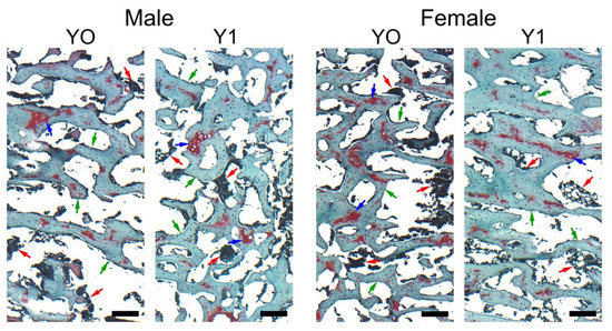 Representative images of Safranine O staining carried out on formaldehyde-fixed sections of trabecular bone in the proximal section of the tibia from representative 6-week old control (Y0) and yeast-fed (Y1) Japanese quail. Green arrows indicate trabeculae, red arrows indicate bone marrow, blue arrows indicate areas of reduced mineralization of newly formed trabeculae. All the scale bars represent 100 µm.