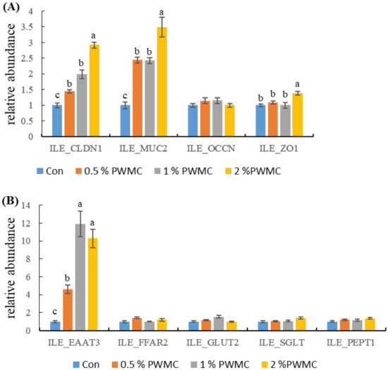 Most nutrient absorption is through transporters on the intestinal epithelial cells. By adding PWMC to broiler feed, excitatory amino acid transporter 3 (EAAT3) levels significantly increased by about 5, 12, and 11 times for the 0.5%, 1%, and 2% PWMC groups, respectively (Figure 1B, p < 0.0001). However, the expression of other nutrient absorption-related mRNA, like free fatty acid receptor 2 (FFAR2), glucose transporter 2 (GLUT2), sodium-dependent glucose cotransporter 1 (SGLT), and peptide transporter 1 (PEPT1), was not significantly different from the control (Figure 1B).