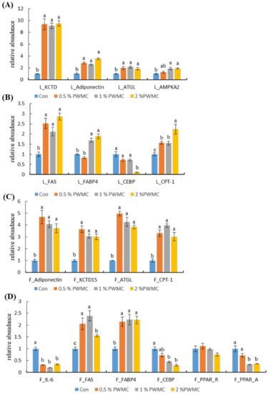 The mRNA expression of potassium channel tetramerization domain-containing 15 (KCTD-15), adiponectin, adipose triglyceride lipase (ATGL), and 5′-AMP-activated protein kinase catalytic subunit alpha-2 (AMPK-α2) were significantly increased in the livers (L) of the treatment groups (p < 0.0001, < 0.0001, =0.0024 and = 0.0015, respectively), thereby increasing the rate of adipolysis (Figure 2A). There was no significant difference among the PWMC-supplemented groups. Similar results are shown in Figure 2C, where the adipolysis-related mRNA, including adiponectin, KCTD15, ATGL, and carnitine palmitoyltransferase 1 (CPT-1) (all of the p < 0.0001), increased in adipocytes (F) by at least four times. However, the adipogenesis-related mRNA shown in Figure 2B, including fatty acid synthase (FAS), fatty acid binding protein 4 (FABP4), and CCAAT-enhancer-binding proteins-alpha (CEBPα), had a compensatory one to three times increase in the adipocytes (p < 0.0001, <0.0001 and = 0.0052) (Figure 2D). When comparing adipogenesis- and adipolysis-related mRNA, the relative abundance of adipolysis-related mRNA expression was much higher (Figure 2). Nevertheless, interleukin-6 (IL-6) mRNA expression in adipocytes decreased (p < 0.0001), thereby decreasing inflammation.