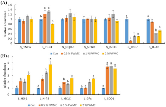 When testing for inflammation-related mRNA expression in the spleens of 35-day-old broilers, there were no significant differences in TNF-α, NADPH dehydrogenase 1 (NQO-1), nuclear factor kappa B p 65 (NFκB), and inducible nitric oxide synthase (iNOS) levels (p > 0.05). However, the levels of toll-like receptor 4 (TLR4), a major lipopolysaccharide receptor, were higher in the 0.5% and 1% PWMC groups (p = 0.015). Both interferon-γ (IFN-γ) and interleukin-1ß (IL-1ß) levels decreased significantly (p < 0.0001 and = 0.0002, respectively), by about three to five times for IFN-γ and 1.1 to 1.6 times for IL-1ß (Figure 3A).