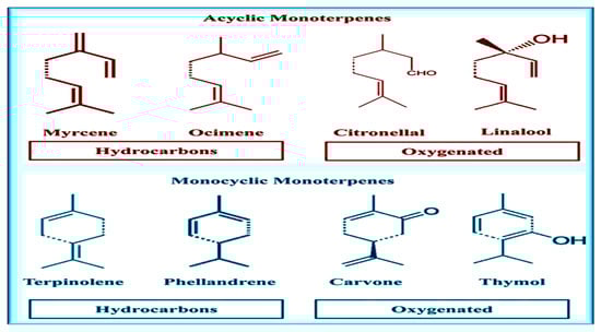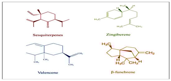 Singh et al. [] extracted basic oil from Zingiber officinale fresh roots and described GC–MS protocol of the basic oil. They mentioned the presence of 69 ingredients, calculating for 96.93% of the whole oil. The vital ingredient was zingiberene (28.62%) then camphene (9.32%), then curcumene (9.09%) and finally β-phellandrene (7.97%). Analysis of the oleoresin mentioned the existence of 34 ingredients, measuring for 88.63% of the whole oleoresin. The critical ingredients were trans-6-shogaol (26.23%), trans-10-shogaol (13.0%), α -zingiberene (9.66%) and 10-gingerdione (6.80%). Furthermore, the basic oil was discovered to be 100% Fusarium oxysporum antifungal effect, while at the same time, oleoresin showed 100% antifungal in contact with Aspergillus niger. The foregoing showed advanced antioxidant action in sunflower oil in comparison with the basic oil or synthetic antioxidants (BHT and BHA). In addition, Sharma et al. [] analyzed basic oil extracted from the raw roots of Z. officinale collected from Ghaziabad area in order to assess its antimicrobial action. The fresh roots were exposed to hydrodistillation to obtain the basic oil content which was analyzed by either GC or GC-MS protocols. The extracted oil was assessed for antimicrobial action by disc diffusion technique. Data showed that the extracted basic oil was distinguished by a high proportion of sesquiterpenes (66.66%) then monoterpenes (17.28%) and aliphatic ingredients (13.58%) as presented in Figure 1. The major sesquiterpene components (Figure 2) were zingiberene (46.71%) then valencene (7.61%), β-funebrene (3.09%) and selina-4(14),7(11)-diene (1.03%). Additionally, monoterpenes were distinguished as citronellyl n-butyrate (19.34%) then β-phellandrene (3.70%), camphene (2.59%) and α-pinene (1.09%). Also, Sasidharan et al. [] discovered that inconstant oils came from two topmost prevailing cultivars from Sikkim namely, Bhaisa and Majulay, were detached, and distinguished by GC or GC-MS analytical protocols. Sixty ingredients representing about 94.9% and 92.6% of the Bhaisa and Majulay oils were recognized. The significant ingredients of Bhaisa oil were geranyl acetate (18.8%) then zingiberene (16.3%) and finally geranial (8.2%) and those of Majulay oil were zingiberene (19.8%) then geranial (16.5%). Compared to various ginger cultivar oils, the Bhaisa oil possessed senior constituents of oxygenated ingredients (43.1%).