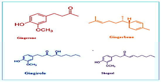 El-Baroty et al. [] demonstrated that basic oils extracted from the roots of Zingiber officinale were distinguished by TLC or GC–MS analytical protocols, and both their antioxidant and antimicrobial ingredients were mentioned by TLC supported bioautography techniques. Ginger oil was differentiated by great constituent of sesquiterpene hydrocarbons, including β-sesquiphellandrene (27.16%) then caryophyllene (15.29%), zingiberene (13.97%), α-farnesene (10.52%) and curcumene (6.62%). Chemical structure of important phytochemicals present in ginger is presented in Figure 3.