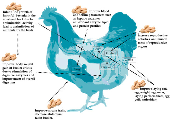 Ginger roots extracted basic oil could be utilized in poultry to minimize lipid peroxidation status in germinal tissues and so, advanced the fertility status. In addition, oral application of 100–150 µl/kg BW of ginger roots extracted basic oil on laying Japanese quails, the highest outcomes on egg mass and lowered egg levels without any harmful factors on feed uptake and BW profits []. On the other hand, Herve et al. [] noticed that egg productiveness features, and weekly weight of eggs were not clearly affected by oral application of ginger roots extracted basic oil. An et al. [] investigated ginger extract on the productiveness, antioxidant and immunity features of laying hens. The control birds were fed the basic diet; the experimental birds were fedbasic diets plus 0.1% ginger extract. Ginger extract clearly advanced laying rates with daily egg weight.