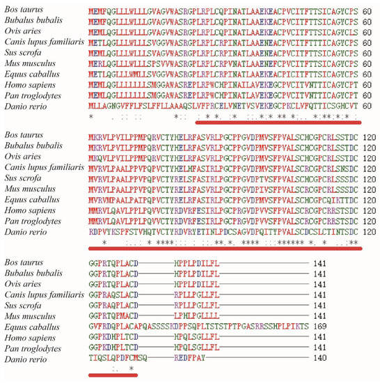 Multiple amino acid sequence alignments of Bos taurus (NM_173930.1), Bubalus bubalis (NM_001290957.1), Ovis aries (NM_001009380.1), Canis lupus familiaris (NM_001197033.1), Sus scrofa (XM_005664701.1), Mus musculus (NM_008497.2), Equus caballus (NM_001197093.1), Homo sapiens (NM_000894.2), Pan troglodytes (NM_001071803.1), and Danio rerio (NM_205622.2). Glycoprotein hormone beta chain (GHβ) homologues are indicated by red underlining. The same sequence is indicated by an asterisk. The conservative and semi-conservative mutations are represented by “:” and “.”, respectively.
