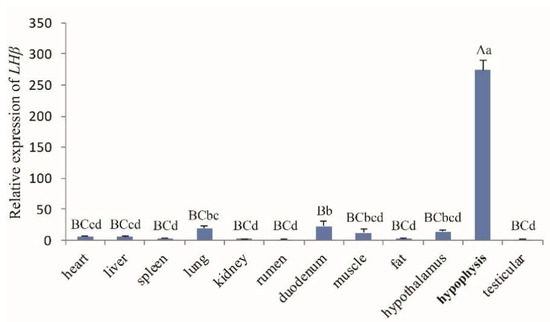 The LHβ mRNA expression profile of various tissues in Hu rams. Note: Different capital letters indicate an extremely significant difference (p < 0.01), and different lowercase letters indicate a significant difference (p < 0.05).