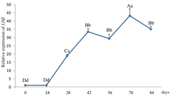 Developmental changes in hypophyseal LHβ mRNA expression in lambs aged 0–84 days. Note: Different capital letters indicate an extremely significant differences (p < 0.01), and different lowercase letters indicate a significant difference (p < 0.05).