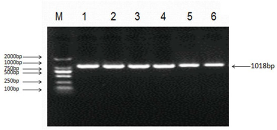 Polymerase chain reaction (PCR) amplification of the ovine LHβ gene. 1~6 Lane: 1018 bp fragment of ovine LHβ gene; M: DNA Marker (DL2000).