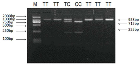 Sequencing of 1018 bp PCR product was amplified from a DNA pool obtained from eight Small-Tailed Han Sheep using the primer pair LHβ-SNP-S and LHβ-SNP-A (Table 1, Figure 5) revealed a synonymous mutation, g.727C > T in the sheep LHβ gene (Figure 6). This mutation was confirmed by PCR-RFLP analysis using the BsrB I restriction enzyme, which generated a 938 bp band representing the allele C, and the bands of 713 bp and 225 bp representing the allele T (Figure 7).