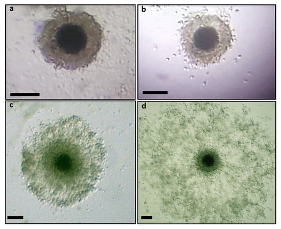 Canine cumulus–oocyte complexes (COCs) after 72 h of in vitro maturation. (a,b) COCs without cumulus cell expansion; (c,d) COCs with different grades of cumulus cell expansion (bar: 100 μm).