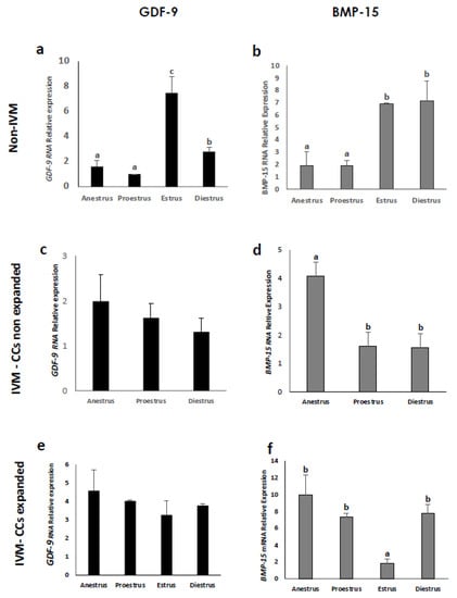 Relative gene expression of Growth Differentiation Factor 9 (GDF-9) and Bone Morphogenetic Protein 15 (BMP-15) from cumulus cells of nonmatured COCs (a,b) (~350 COCs at each phase of the estrous cycle), in vitro-matured non-expanded COCs (c,d) (~300 COCs at anestrus, proestrus and diestrus), and in vitro-matured expanded cumulus cells (e,f) (~300 at each phase). The mRNA levels were expressed in relation to β-Actin mRNA as the control or housekeeping gene. Different letters above the bars indicate differences at p < 0.05.
