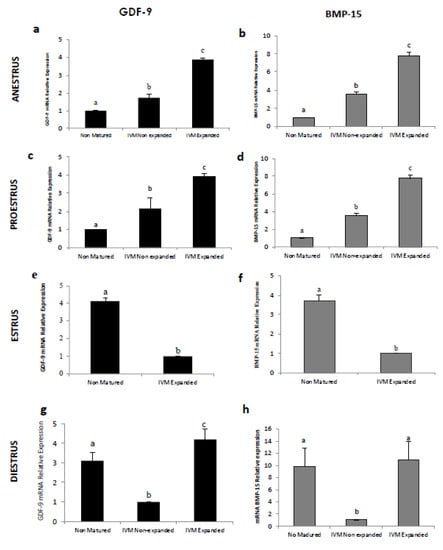 Comparing gene expression between CCs retrieved from non-cultured COCs and those from COCs after IVM, both expanded and nonexpanded (Figure 4), CCs surrounding IVM oocytes obtained in anestrus (Figure 4a,b) and proestrus (Figure 4c,d) expressed significantly higher mRNA levels of GDF-9 and BMP-15 than those from nonmatured oocytes. In contrast, gene expression of both genes in CCs collected from IVM COCs during the estrus phase (Figure 4c,f) was lower in IVM COCs (p < 0.05) than in those from nonmatured COCs. The majority of COCs after IVM obtained in the estrus phase exhibited almost only expanded CCs, so the number of CCs that did not mucify was too small to extract RNA from. At diestrus (Figure 4g,h), CCs from nonmatured COCs exhibited higher GDF-9 and BMP-15 mRNA levels (p < 0.05) than nonexpanded CCs after IVM. However, COCs with cumulus expansion after IVM expressed higher (p < 0.05) mRNA levels compared to nonmatured COCs.