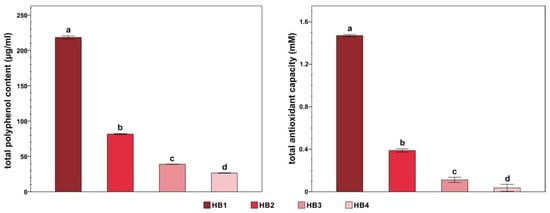 Total polyphenol content and total antioxidant capacity of the honeybush aqueous extracts. Different letters indicate significant differences between treatments (p < 0.01). The total polyphenol content is expressed as gallic acid equivalents. The total antioxidant capacity is expressed as Trolox equivalents. HB = honeybush. Treatments = HB1 (20 mg/mL); HB2 (5 mg/mL); HB3 (1.25 mg/mL); HB4 (0.3125 mg/mL). The data are shown as the mean ± standard deviation of four replicates.