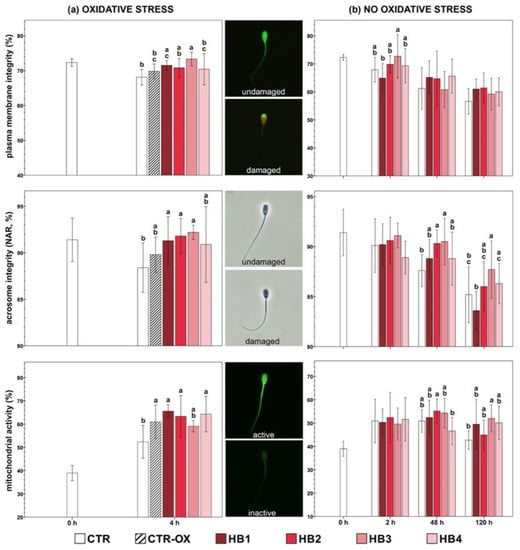 There were no differences between the CTR group and the CTR-ox group in the sperm plasmalemma integrity (p > 0.05; Figure 2a). On the other hand, the HB3 treatment showed a better plasma membrane stability than the CTR-ox group (p = 0.013). Moreover, the HB1 and HB3 treatments showed a higher percentage of spermatozoa with an intact plasma membrane, when compared with the CTR group (p < 0.05). While we did not find significant differences between the CTR-ox and the HB treatments in acrosome integrity, it tended to be higher in the HB3 treatment (p = 0.089; Figure 2a). In addition, three HB treatments (HB1, HB2, and HB3) showed a higher percentage of intact acrosome than the CTR group (p < 0.05).