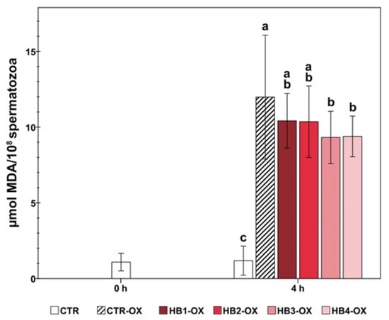Effect of honeybush extract on the lipid peroxidation in boar sperm samples under oxidative stress (except CTR). Different letters indicate significant differences between treatments (p < 0.05). MDA = malondialdehyde; CTR = control samples; OX = samples under induced oxidative stress; HB = honeybush; Treatments = HB1 (200 µg/mL); HB2 (50 µg/mL); HB3 (12.5 µg/mL); HB4 (3.125 µg/mL). The data are shown as the mean ± standard deviation of five replicates.