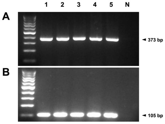 (A) mRNA of TRPM7 was detected in five (1–5) canine mammary gland tissues by reverse transcription-polymerase chain reaction (RT-PCR). The amplified products of TRPM7 (373 bp) were observed in all canine mammary gland samples. (B) To confirm the integrity of the extracted RNA, the amplified products of glyceraldehyde 3-phosphate dehydrogenase (105 bp) were used as the positive controls. The negative controls (N) are the last lanes on the right.