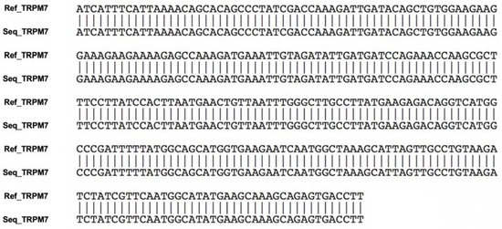 Nucleotide sequences of the amplified PCR products. Ref_TRPM7 indicates the TRPM7 sequences obtained from the National Center for Biotechnology Information sequence database. Seq_TRPM7 indicates the TRPM7 sequences obtained using RT-PCR in the present study. Each nucleotide sequence matched the expected sequences of canine TRPM7.