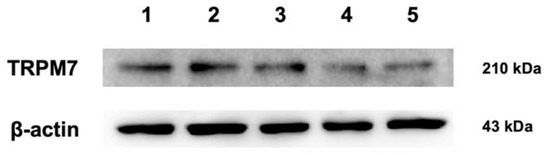 Protein expression of TRPM7 in the five (1–5) canine mammary gland tissues revealed by Western blotting. The immunoreactive bands of approximately 210 kDa were confirmed in all samples. β-Actin (43 kDa) was used as the loading control.