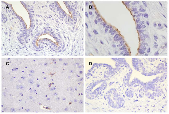 TRPM7 (A,B) immunohistochemistry in the canine mammary gland. Immuno-positive staining localized in the apical membrane of ductal epithelial cells (C) In the positive control, positive immune-reactions were observed in the perinuclear compartments and cytoplasm of the neurons in the mouse brain. (D) No specific staining was observed in the negative control. Cell nuclei were stained with Mayer’s hematoxylin. (A, C, D original magnification ×400; B original magnification ×1000).