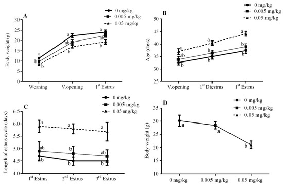Effect of T-2 toxin exposure on: (A) body weight (Body weight at Weaning, Vaginal opening, 1st Estrus), (B) age in days (Age at Vaginal opening, 1st Diestrus, 1st Estrus), (C) length of estrus cycle, (D) necropsies body weight after three consecutive estrus cycles, of female mice whose dams were orally administered with T-2 toxin at 0, 0.005, and 0.05 mg/kg from gestational day 14 (GD 14) to lactational day 21 (LD 21). Each value represents the mean ± SEM of the group (n = 5). Different letters indicate statistically significant differences, p < 0.05.