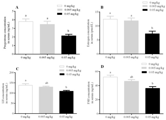 The concentrations of progesterone (P4) and estrogen (E2) in the serum were significantly decreased in the 0.05 mg/kg treated group as compared to the 0.005 mg/kg and control groups (p < 0.05) (Figure 2A,B). Similarly, luteinizing hormone (LH) and follicle-stimulating hormone (FSH) were found to be decreased significantly at 0.05 mg/kg (p < 0.05) as compared to control (Figure 2C,D).
