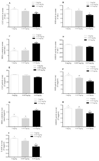 Effect of T-2 toxin exposure on antioxidant enzyme activity on lipid peroxidation content in the serum. (A) catalase (CAT), (B) superoxide dismutase (SOD), (C) malondialdehyde (MDA), (D) glutathione peroxide (GSH-Px). Effect of T-2 toxin exposure on antioxidant enzyme activity on lipid peroxidation content in the ovary, (E) catalase (CAT), (F) superoxide dismutase (SOD), (G) malondialdehyde (MDA), (H) glutathione peroxide (GSH-Px) (I) total antioxidant activity (T-AOC), of female mice whose dams were orally administered with T-2 toxin at 0, 0.005, and 0.05 mg/kg from gestational day 14 (GD 14) to lactational day 21 (LD 21). Each value represents the mean ± SEM of the group (n = 5). Different letters indicate statistically significant differences, p < 0.05.