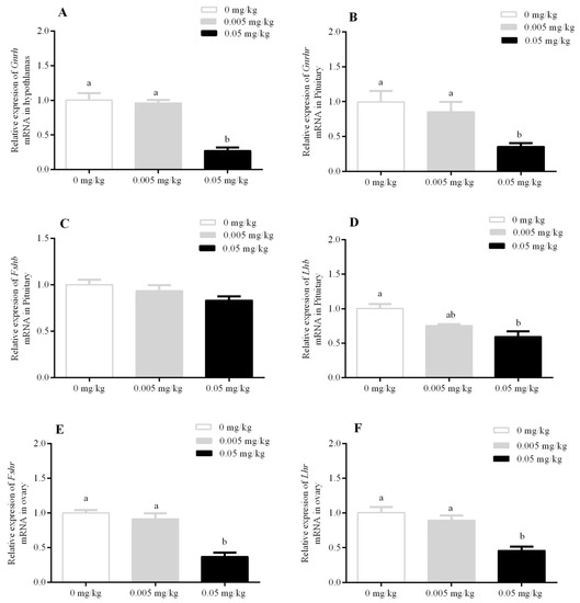 Effect of T-2 toxin exposure on relative mRNA expression of (A) Gnrh in the hypothalamus, relative mRNA expression of (B) Gnrhr, (C) Fshb, (D) Lhb in the pituitary, relative mRNA expression of (E) Fshr and (F) Lhr in the ovaries of female mice whose dams were orally administered with T-2 toxin at 0, 0.005, and 0.05 mg/kg from gestational day 14 (GD 14) to lactational day 21 (LD 21). Each value represents the mean ± SEM of the group (n = 5). Different letters indicate statistically significant differences, p < 0.05.