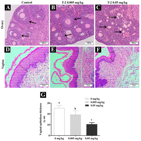Representative pathological changes in ovaries: (A) control, (B) 0.005 mg/kg of T-2 toxin, (C) 0.05 mg/kg of T-2 toxin. The vaginal epithelium thickness: (D) control, (E) 0.005 mg/kg of T-2 toxin, (F) 0.05 mg/kg of T-2 toxin, and (G) measurement of vaginal epithelium thickness of mice offspring whose dams were orally administered with T-2 toxin at 0, 0.005, and 0.05 mg/kg from gestational day 14 (GD 14) to lactational day 21 (LD 21). Black arrows indicate the follicles are in secondary and antral stage in (A,B) and in (C) it indicates atretic follicles. Black lines in (D–F) indicate vaginal epithelium thickness. Scale bar: ovary 100 μm and vagina 50 μm.