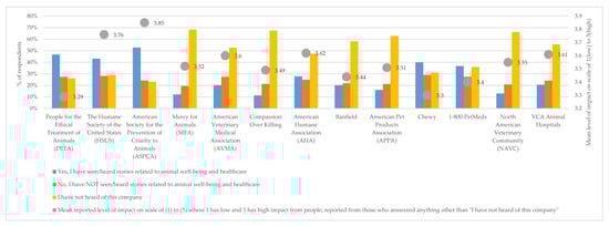 Figure 1 compares the mean responses on a Likert scale to the question “I have seen/heard stories related to animal well-being and health care for this organization.” Generally, organizations with higher percentages of respondents indicating that they have not heard of it also had lower scores on the impact level on animal well-being and health care by respondents who indicated anything other than “I have not heard of this company”. An exception to this was PETA, where almost 50% of respondents indicated that they heard/saw stories related to animal well-being and health care, but the mean reported level of impact was low—in fact, the lowest across the organizations.