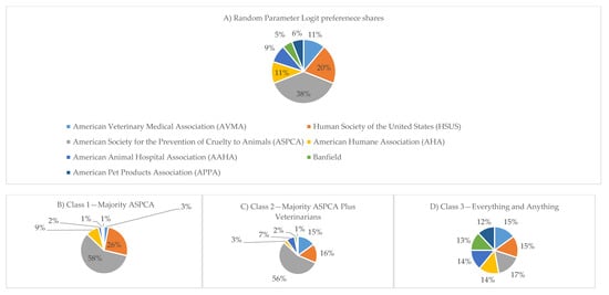 Preference shares of animal welfare organizations determined by (A) Random Parameters Logit and (B–D) Latent Class Model (n = 1000).