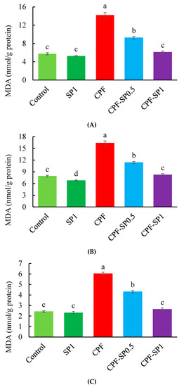 CPF induced the lipid peroxidation in tilapia by displaying significantly high levels of MDA in liver, kidneys, and gills over the control (p ≤ 0.05) (Figure 1). Without CPF toxicity, SP inclusion in tilapia feeds markedly reduced the MDA levels compared with the control group. Furthermore, fish exposed to CPF showed higher MDA in liver, kidneys, and gills than CPF-intoxicated groups fed with SP at 0.5 or 1% levels (Figure 1).