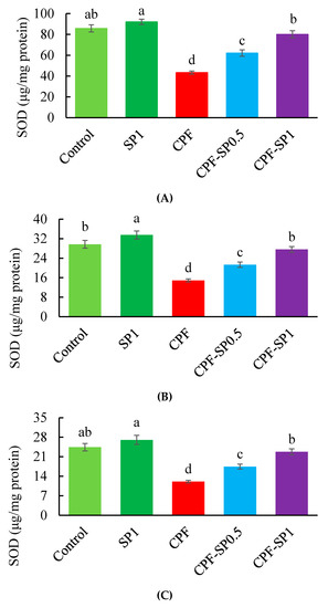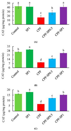 Results of antioxidant biomarkers (SOD and CAT) are presented in Figure 2 and Figure 3, respectively. Fish exposed to CPF exhibited lower SOD and CAT than the control and SP groups without CPF toxicity (p ≤ 0.05). Under CPF toxicity, tilapia fed with SP at 0.5% or 1% levels displayed higher SOD and CAT levels than fish fed the basal diet without SP. The levels of SOD and CAT were higher in tilapia fed with SP at 1% than tilapia fed with 0.5% under CPF toxicity. In non-CPF-intoxicated groups, CAT showed increased activities in kidney and gills tissues of fish fed with SP (Figure 3B,C), while no alterations were stated in the case of liver CAT (p > 0.05) (Figure 3A).