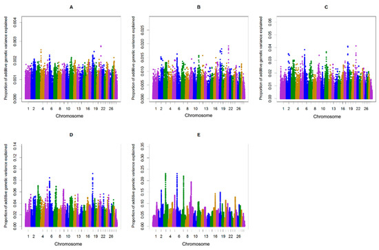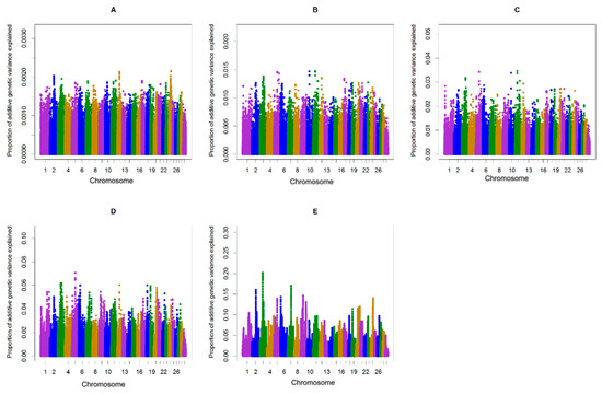Additive genetic variance explained by windows of (A) 1, (B) 5, (C) 10, (D) 20, and (E) 50 consecutive single nucleotide polymorphisms (SNPs) across chromosomes for the length of the calving interval in primiparous cows.