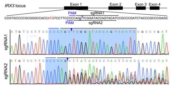 Design and assessment of sgRNAs targeting Bama minipig IRX3. Two potential sgRNAs (sgRNA1 and sgRNA2) were designed for targeting exon 1 of the Bama minipig IRX3. Two CRISPR/Cas9 vectors were individually introduced into cultured Bama minipig kidney fibroblast cells by Lipofectamine transfection to assess targeted DNA cleavage efficacy. The DNA sequencing results show that sgRNA2 caused a much higher proportion of targeted mutations than sgRNA1. The sgRNAs and protospacer adjacent motif (PAM) sequences are marked with the black and blue lines, respectively. The predicted cleavage sites are indicated by the blue arrowheads.