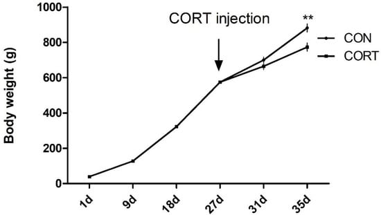 Broilers showed linear growth from 1 to 35 days of age. However, consecutive CORT injections for seven days significantly slowed weight gain when compared to control chickens (p < 0.01; Figure 1).