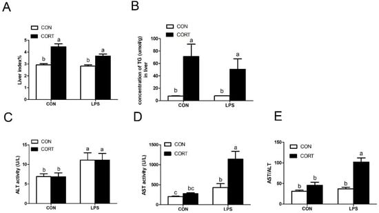 Level of liver index and biochemical parameters. (A) Liver index; (B) Hepatic TG content; (C) plasma alanine aminotransferase (ALT) activity; (D) plasma aspartate aminotransferase (AST) activity; (E) AST/ALT ratio. C-CON, control group; C-CORT, corticosterone-treated group; L-CON, LPS-treated group; L-CORT, LPS- and corticosterone-treated group. Data are presented as means ± SEM (n = 8). a–c Means with different small letter superscripts are significantly different (p < 0.05).