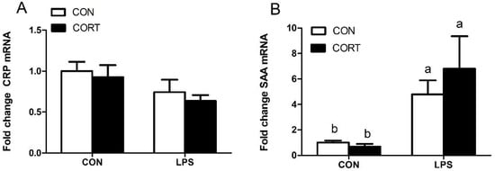 As shown in Figure 4, LPS, but not CORT, significantly upregulated hepatic expression of SAA mRNA (p < 0.05). Hepatic expression of CRP mRNA did not change following treatment with either CORT or LPS.