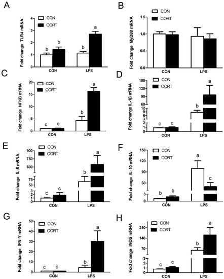 Expression of hepatic genes related to inflammation. (A) Hepatic TLR4 mRNA expression. (B) Hepatic MyD88 mRNA expression. (C) Hepatic NFκB mRNA expression. (D) Hepatic IL-1β mRNA expression. (E) Hepatic IL-6 mRNA expression. (F) Hepatic IL-10 mRNA expression. (G) Hepatic IFN-γ mRNA expression; (H) Hepatic iNOS mRNA expression. C-CON, control group; C-CORT, corticosterone-treated group; L-CON, LPS-treated group; L-CORT, LPS- and corticosterone-treated group; Data were normalized to the expression of the 18S rRNA gene and are presented as means ± SEM (n = 8). a–c Means with different small letter superscripts are significantly different (p < 0.05).