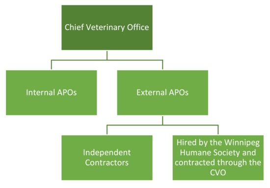 There are different groupings of APOs. Internal APOs are direct, public, government employees. External APOs are contracted to undertake investigations. External APOs fit into two further categories: independent contractors and those who work for the Winnipeg Humane Society but are appointed by the CVO and focus on cruelty investigations (Figure 1). Under Canadian laws, independent contractors, even though they are people, are legally considered to be individual businesses that are under contract to another organization or business. As a result, APOs who are independent contractors are not legally classified as employees and are exempt from most labour laws and employment standards.