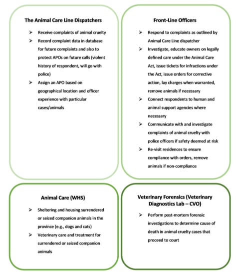 Each year, the greatest number of calls the WHS receive are emergency pick-ups of injured animals, and this clearly takes up a great deal of APO time. In Canada, this kind of work is normally undertaken by municipal/local animal control services and seen as distinct from animal cruelty investigations in most jurisdictions []. Municipalities often outsource these kinds of animal care and control tasks to private organizations, including nonprofits [].