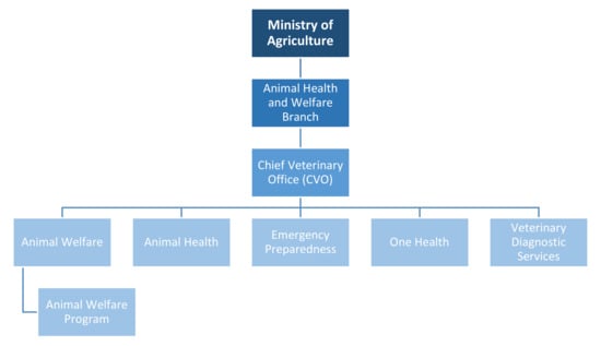 Manitoba is one of the only Canadian provinces (and jurisdictions within the Commonwealth) which has a publicly funded animal protection system, rather than charity-based and donation-dependent enforcement []. Yet, there is a dearth of research on its policy and approach. Here, we begin to fill this gap. We explain how animal cruelty is investigated in Manitoba and pay particular attention to the organizational structure and resulting investigations process. Animal protection work in Manitoba is coordinated and overseen by the Chief Veterinary Office (CVO), which is housed within the Ministry of Agriculture. However, Manitoba’s approach is not actually a fully public enforcement model but rather a publicly funded and public–private hybrid delivery approach. We assess its strengths and identify areas for improvement.