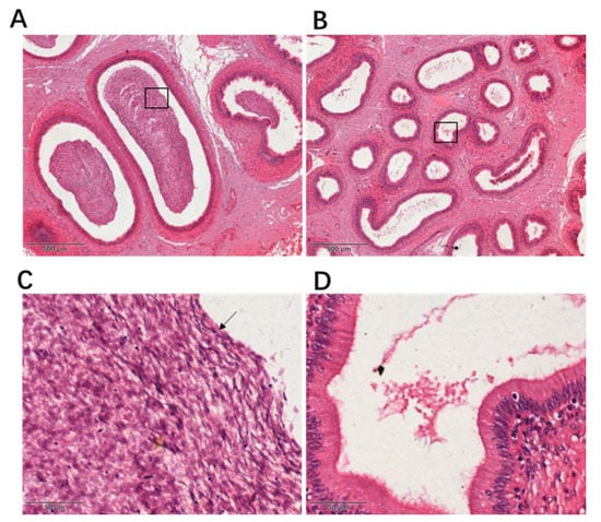 Histological examination of the epididymis in yaks and cattle–yaks. Magnification: 40× (images A, B), 400× (images C, D). (A) Sections of H&E-stained yak epididymis. (B) Sections of H&E-stained cattle–yak epididymis. (C) Enlargement of the part of image A framed by the black rectangular box. The arrow indicates the yak sperm. (D) Enlargement of the part of image B framed by the black rectangular box.