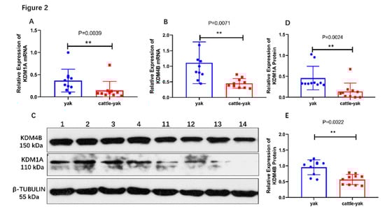 The mRNA levels of KDM1A/KDM4B in the testes of yaks and cattle–yaks were assayed using quantitative Real-time PCR with KDM1A/KDM4B-specific primers. The results showed that the relative mRNA levels of the KDM1A and KDM4B genes in the testes of cattle–yaks were significantly lower (p < 0.01) than those in yaks (Figure 2A,B).