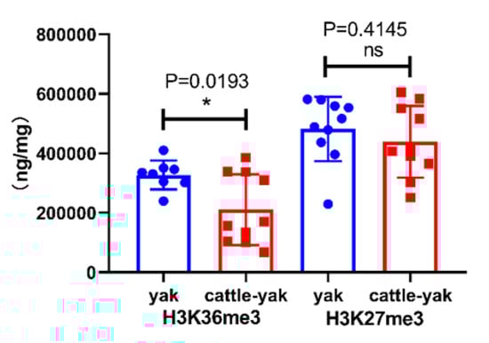 The ELISA results showed that the level of H3K36me3 was significantly decreased in the testes of cattle–yaks compared with yaks, but not for H3K27me3 (Figure 3).