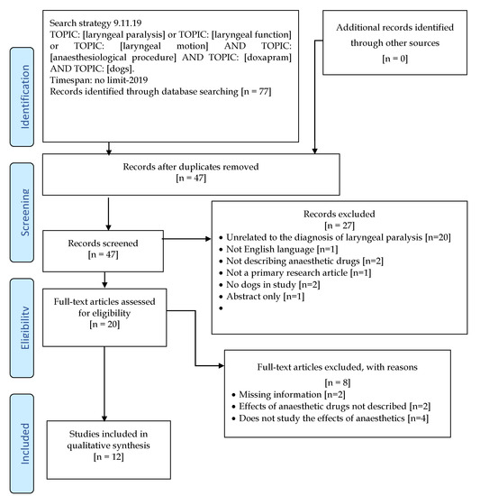 The review structure and search strategies evaluating the effects of anaesthetic drugs on the laryngeal motion in dogs [9].