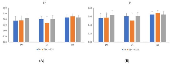 (A) Shannon index of biodiversity (H’) and (B) Evenness (J’) of the microbial communities for dietary treatments with increasing dose of grape proanthocyanidins. H’ and J’ were calculated on the relative abundances of genera in the feces of dogs fed a basal diet supplemented with increasing amount of grape proanthocyanidins (D0, D1, and D3). D0: Dogs without supplementation of proanthocyanidins; D1: Dogs supplemented with 1 mg/kg live weight of proanthocyanidins; D3: Dogs supplemented with 3 mg/kg live weight of proanthocyanidins. T0: beginning of the study; T14: after 14 days of the study; and T28: after 28 days of the study.