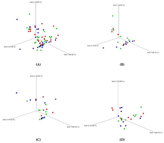 Principal coordinate analysis (PCoA) plot representing the beta diversity of the microbial community between dietary treatments with increasing dose of grape proanthocyanidins (D0, D1, and D3). PCoA was calculated on the weighted UniFrac distance matrices. (A) Beta diversity for the three dietary treatments and the three times of sampling; (B) beta diversity for the three dietary treatments and at the beginning of the study (T0); (C) beta diversity for the three dietary treatments after 14 days (T14); and (D) beta diversity for the three dietary treatments after 14 days (T14).