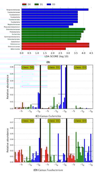 Analysis of similarity (ANOSIM) was then performed to test whether the microbial communities differed significantly between D0, D1, and D3 diets at T0, T14, and T28 times of sampling, using the ‘Vegan’ package in R (Version 3.2.1). A linear discriminant analysis (LDA) effect size (LEfSe) was applied to detect taxa that differed between D0, D1, and D3 groups at T0, T14, and T28 [].