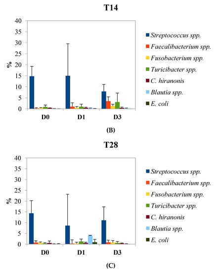 The results of the qPCR analysis are reported in Figure 4. The panels A, B, and C represent the percentage of Faecalibacterium spp., Fusobacteria, Blautia spp., Turicibacter spp., Escherichia coli, Clostridium hiranonis, and Streptococcus spp. during time in comparison of total bacteria. At the beginning of the experiment (Figure 4A), the amount of the monitored microorganisms was similar in group D0 and D3, while in group D1, a higher amount of Faecalibacterium spp., Fusobacterium, and Clostridium hiranonis was found, corresponding to the 8.8%, 3.8%, and 11.2%, respectively. After 14 days of the treatment (Figure 4B), several changes have been observed. For the D0 group, the concentration of Streptococcus spp. increased considerably, as in the other groups, reaching a concentration of about 15% of the total quantified species (D0 and D1) and 7.9% in D3 samples. Compared to T0, the amount of Faecalibacterium spp., Fusobacterium spp., and Clostridium hiranonis decreased significantly (p < 0.05). In group D3, there was an increase in the amount of the analyzed microorganisms. The last sampling point is characterized by a slight decrease of Streptococcus spp. in all the treatments, but only in group D3 this reduction was significant. Moreover, the other microorganisms decreased among groups except for Blautia spp. in group D1, where a significant increase was observed. Escherichia coli was detected in a very low amount in all the tested groups. Despite this, it is possible to observe that, at T28, for D0 and D1 treatments, the percentage of Escherichia coli was higher than in T0, while in the D3 group, it was lower. In fact, at the beginning of the experiment (T0), the abundance of Escherichia coli was equal to 0.023%, 0.007%, and 0.003% for the groups D0, D1, and D3, respectively, whereas, after 28 days, it was 0.117%; 0.933%; and 0.002% for the groups D0, D1, and D3, respectively.